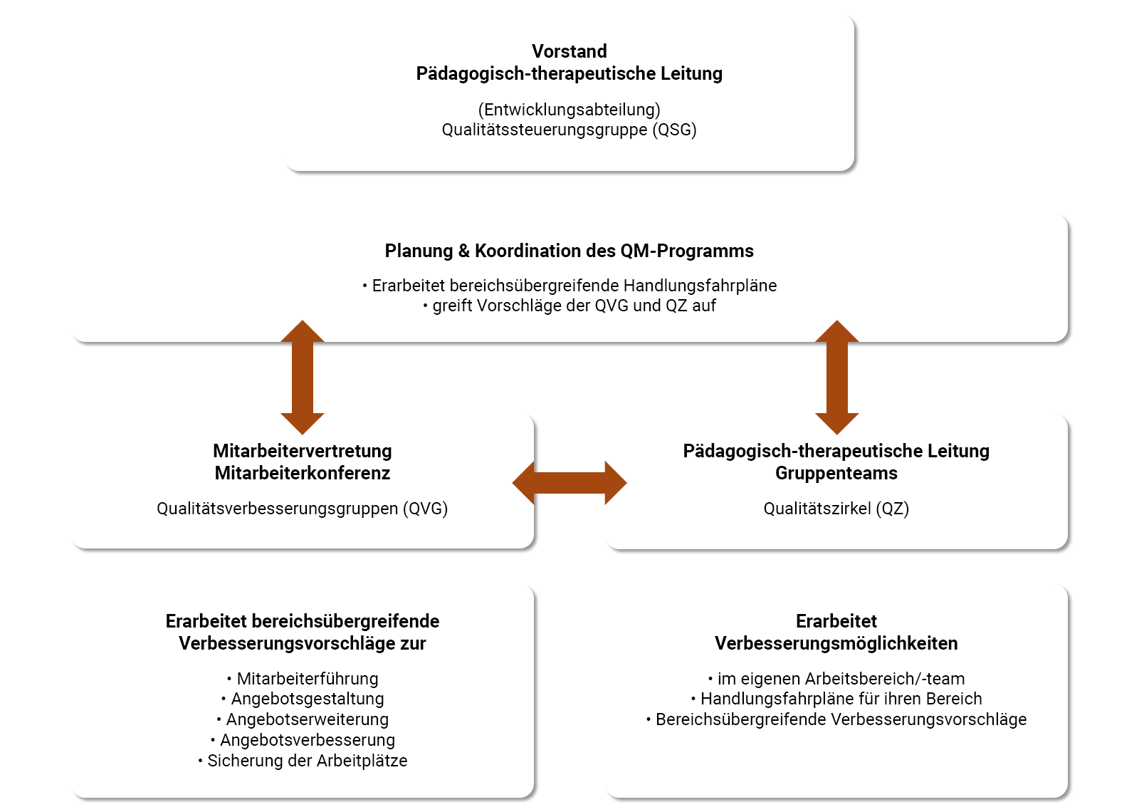 - Dokumentation der Qualitätsentwicklung in einem Q-Handbuch, in dem u.a. systematisch nach und nach alle qualitätsrelevanten Abläufe in „Handlungsfahrplänen“ erfasst werden.